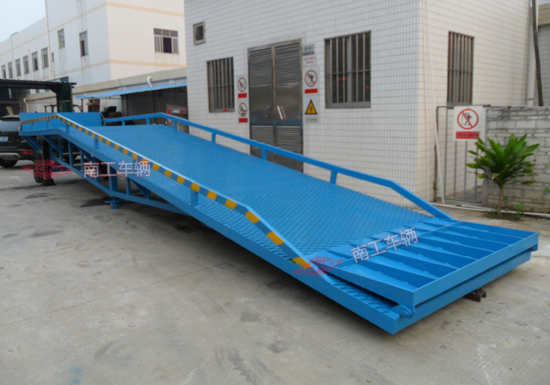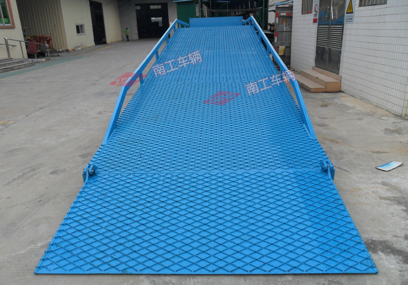 产品介绍:移动登车桥是与叉车配合使用的货物装卸专用辅助设备,适用于装卸作业不固定的场所,如工厂、大型仓库等。叉车可通过其从地面直接驶入货车内部进行作业。该产品具有坚固的钢质焊接支撑结构,表面铺设防滑网或栅格网,即使在雨雪天气下仍可正常使用。采用手动方式调节高度,单人操作即可,使装卸作业变得更省时、省力、省心。十年设计寿命,经久耐用。Movable ramp is used together with forklift for goods handling in factory or big warehouse, it allows forklift to drive on load bed of vehicle directly to load and unload. All steels are well welded in fixture, with anti-slip floor to ensure all-weather adaptability. It has hand-operated height adjustment landing gear; Single person for operating is enough. 10 years of lifespan.